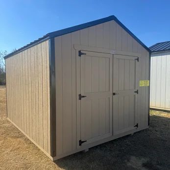 Building 7 is a 10x12 Utility Budget Series shed that proves "budget" doesn't have to mean basic, featuring a sharp buckskin exterior paired with black metal trim and roofing. The interior is a DIYer’s dream, already equipped with a 10-foot workbench and pre-installed electrical wiring. It’s built for heavy use with 6-foot double doors and a rugged diamond plate threshold to protect your entrance. You can claim this versatile workspace for $3,640 plus tax, or get started today with a low $145 down payment.